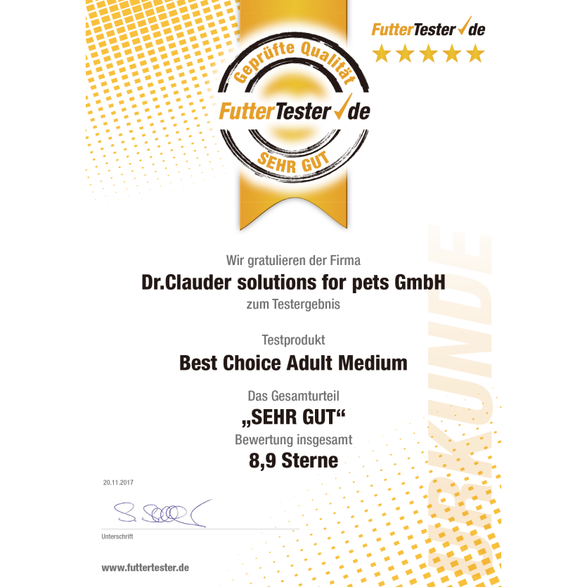 Futter Tester 본문 독일 소비자 테스트 플랫폼인 Futter Tester에서 Best Choice Adult Medium 제품이 소비자 만족도 8.9점 (매우 좋음) 평가를 받았습니다. 목록