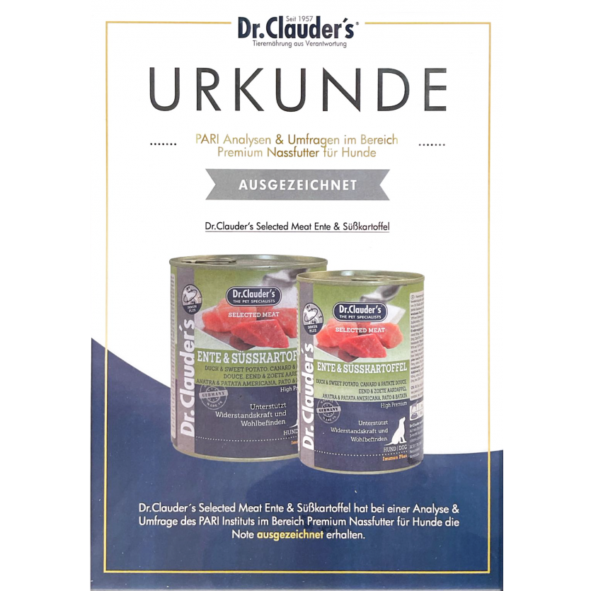 Dr.Clauder’s Selected Meat Ente & Süßkartoffel 제품이 Ausgezeichnet (우수) 등급으로 평가받았습니다.