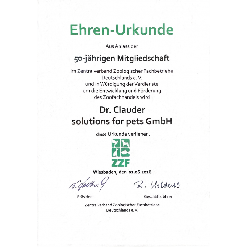 독일 동물 전문점 중앙 협회 ZZF에서 Dr. Clauder's 브랜드가 50년 회원 유지 명예 증서를 받았습니다.